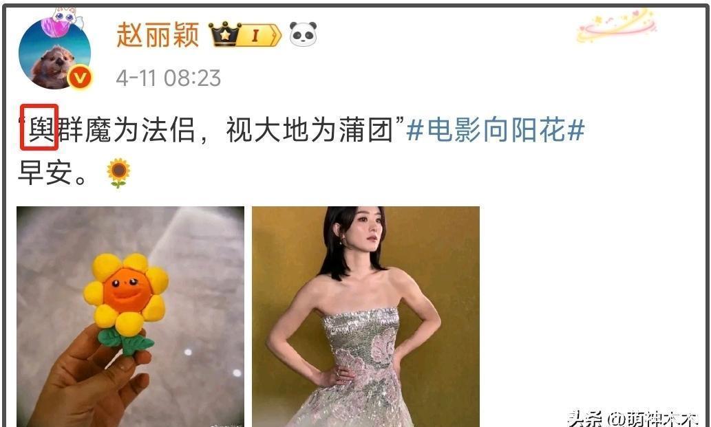 赵丽颖又打错字了!屡屡陷入文盲争议,网友抨击:文化决定上限 《向阳·花》热映期间,赵丽颖因一条动态再度陷入文盲争议。她引用佛家用语“与群魔为法侣,视大地为蒲园”时,将“与”的繁体字“與”误写成“舆”,引发网友群嘲。其实整句话用简体字即可,她偏要繁简混用,结果弄巧成拙,被指想卖弄学识却翻车。
